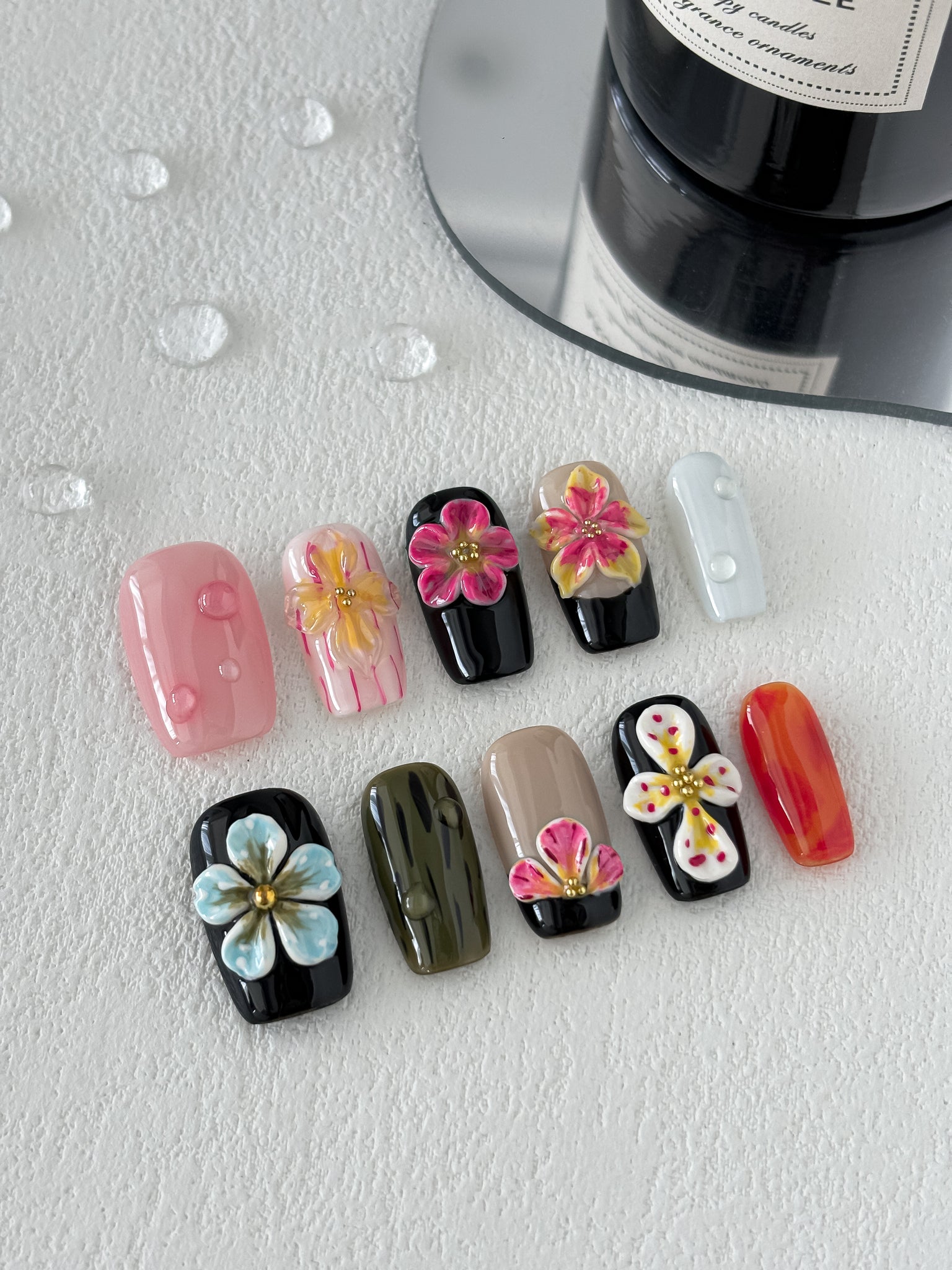 Midnight Bloom features glossy black and neutral bases adorned with delicate 3D florals and soft dewy accents. Elegant yet modern, this press-on set blends romantic petals with a bold midnight edge for a timeless statement look.
